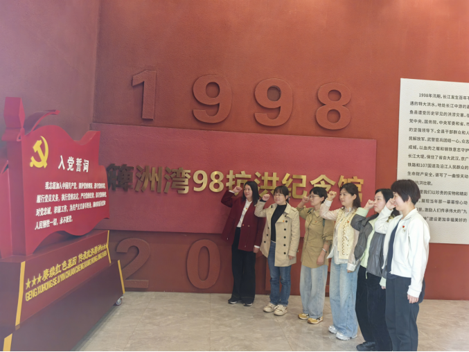 缅怀英雄壮举,重温入党初心。在簰洲湾98抗洪纪念馆,大家通过历史照片、实物展品与影像资料,重温 1998年长江特大洪水期间军民同心、坚守大堤的英雄壮举,深刻感悟伟大抗洪精神的丰富内涵与时代价值。活动现场庄重肃穆,全体党员面向党旗重温入党誓词,誓言铿锵有力;全体人员向抗洪英雄默哀献花,致以崇高敬意。